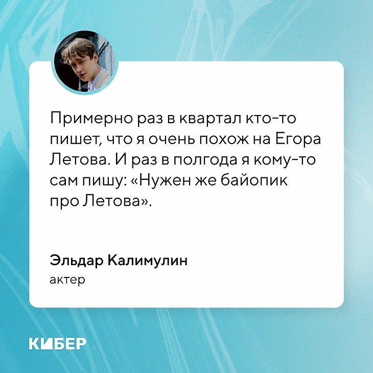 Хотя есть еще такая история: примерно раз в квартал кто-то пишет, что я очень похож на Егора Летова. И раз в полгода я кому-то сам пишу: «Нужен же байопик про Егора Летова». Но я понимаю, что сейчас такое кино будто бы невозможно. Хотя если говорить про байопик, то, наверное, именно про Летова.