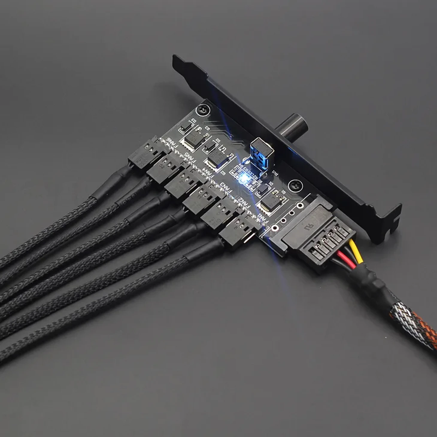 Специальный контроллер – подключается в разъем SYS_FAN и питается кабелем SATA от блока питания. Гаджет упрощает синхронизацию подсветки и скорости работы вентиляторов между собой. В зависимости от модели в контроллеры можно подключить до 10-12 устройств. Обычно контроллер идет в комплекте с корпусом, но при необходимости можно купить его отдельно.