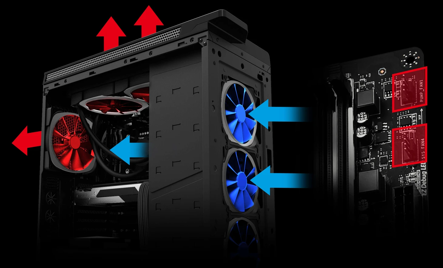 На верхней или задней панелях разместите вентиляторы на выдув, чтобы горячий воздух выходил из корпуса.