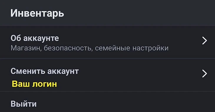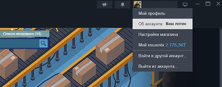 Нажмите на свою аватарку в верхнем правом углу. В открывшемся меню проскрольте вниз до пункта «Сменить аккаунт». Под ним будет указан логин аккаунта Steam.