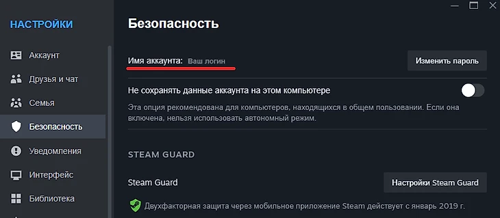 Также логин аккаунта Steam можно найти в настройках. Перейдите в раздел «Безопасность», ваш логин будет указан в строке «Имя аккаунта».