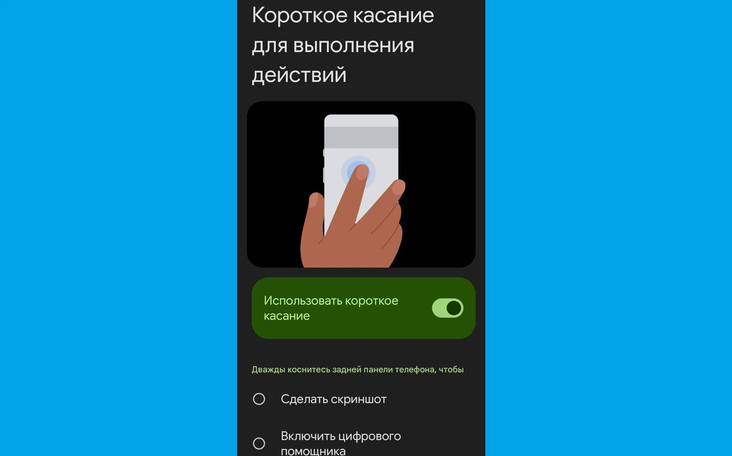 Однако доступность функции зависит от модели телефона. Например, на Google Pixel на двойном нажатии кнопки питания доступны камера и кошелек. Фонарик (и многие другие функции) можно дополнительно запустить через опцию короткого касания задней панели смартфона.