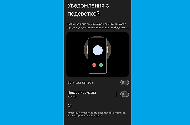 • Выберите одну из опций либо включите обе: «Вспышку камеры» (мигает фонарик) или «Подсветку экрана» (мигание экрана определенным цветом).