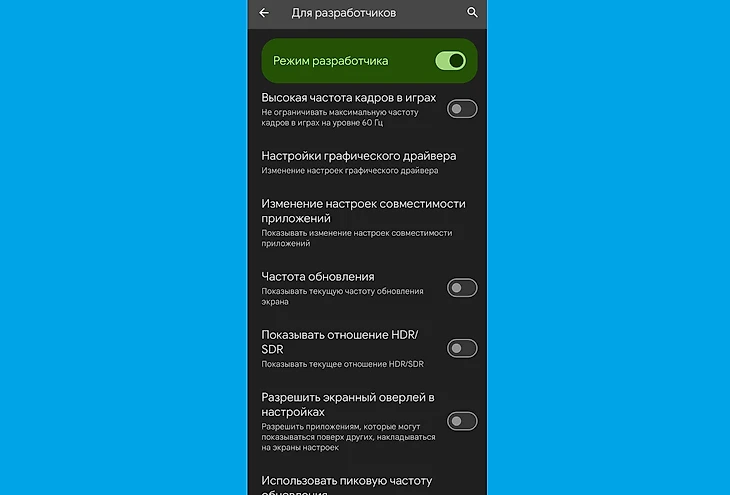 Режим разработчика открывает скрытые настройки: можно отключать лишние анимации или менять их скорость, активировать USB‑отладку, снимать ограничения частоты обновления в играх и многое другое. Чтобы выключить расширенный режим, просто переключите тумблер.