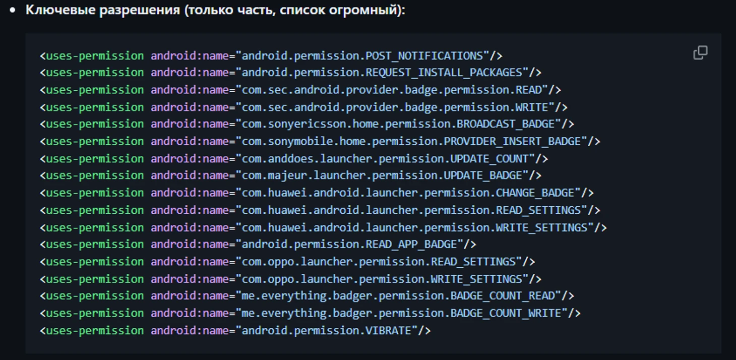 • Хранилище: READ_EXTERNAL_STORAGE, WRITE_EXTERNAL_STORAGE, READ_MEDIA_IMAGES (чтение и запись любых внутренних файлов).