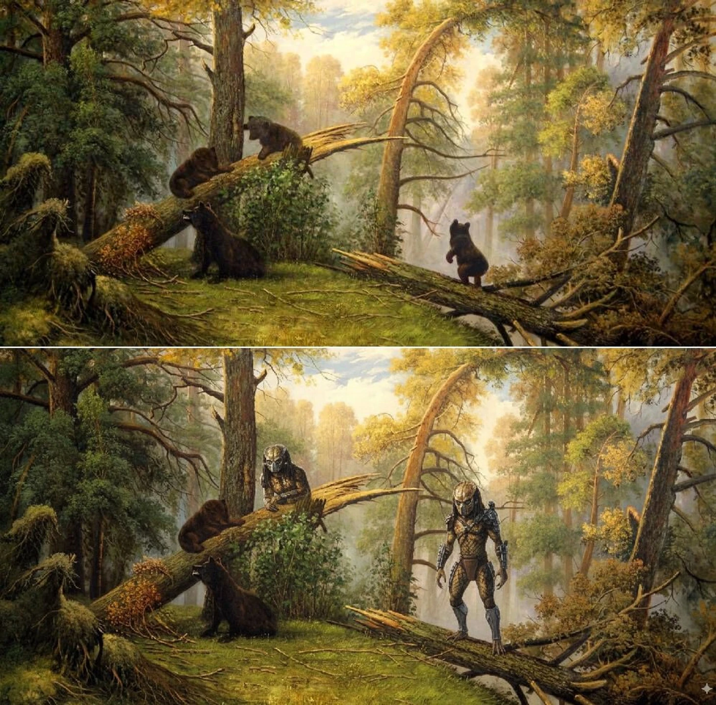 В классической версии картины «Утро в сосновом лесу» не было Хищников, потому что был активирован камуфляж.