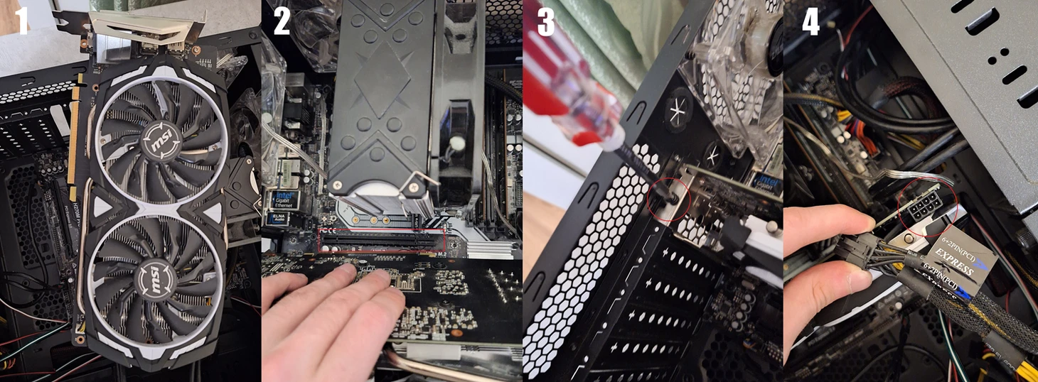 Установите видеокарту – вставьте ее в слот PCI-E до щелчка, закрутите крепление и подключите дополнительное питание.