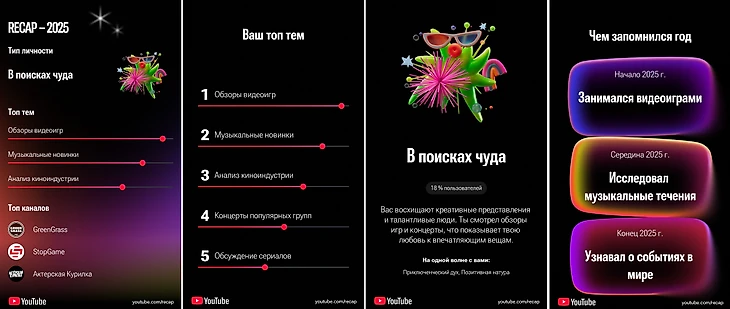 В 2025 году YouTube наконец-то не остался в стороне от подведения персональных итогов года. Google запустила YouTube Recap (не путать с Rewind!) – итоговую статистику пользователя на платформе. Она представляет собой 12 вертикальных карточек с информацией, например, о популярных каналах и темах.