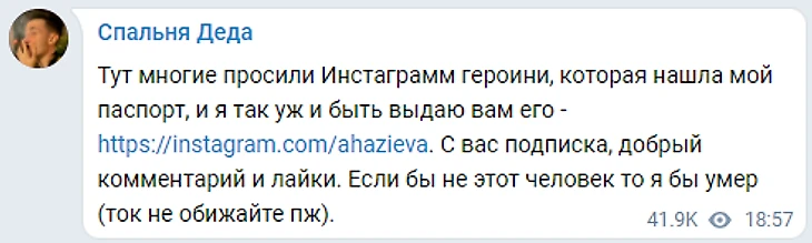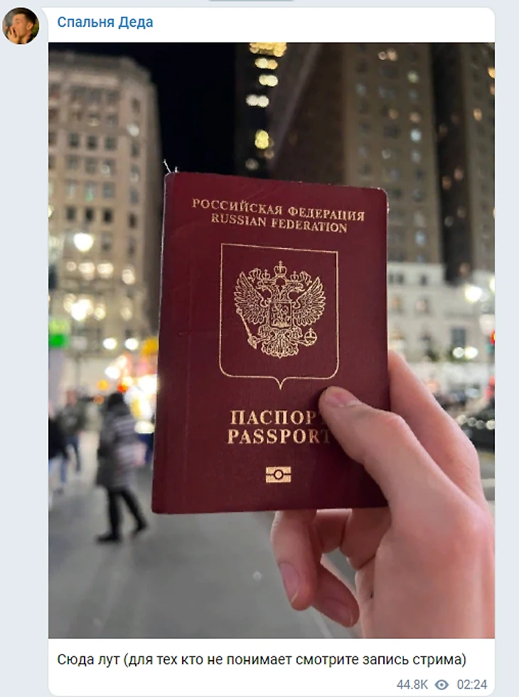 На следующий день в телеграм-канале "Спальня Деда" появился пост с паспортом: