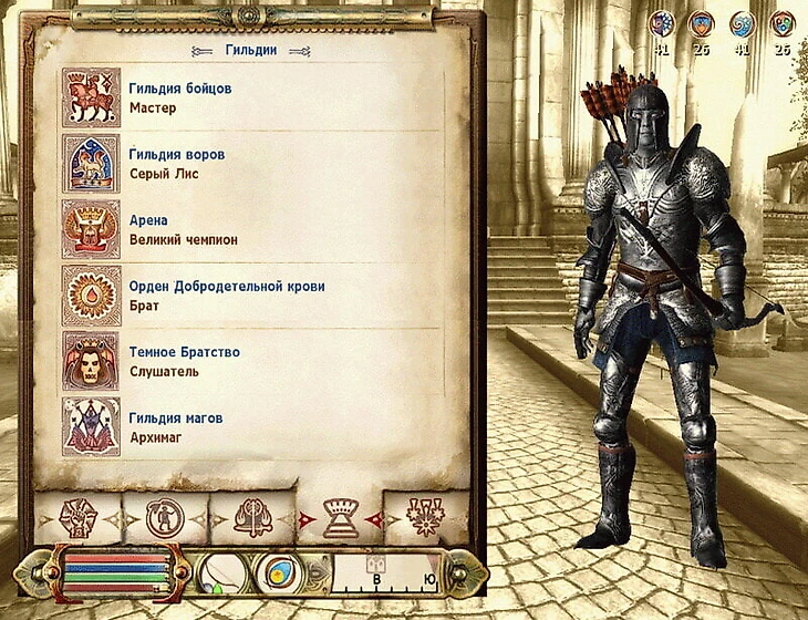 Сайд-квесты и в Обливионе, и в Скайриме интереснее основного сюжета. Но в Oblivion есть малозаметная, но очень приятная фишка. Прогресс в гильдиях можно отслеживать в ранглисте, где отмечен статус игрока: архимаг, брат ордена добродетельной крови. Похоже на список достижений.