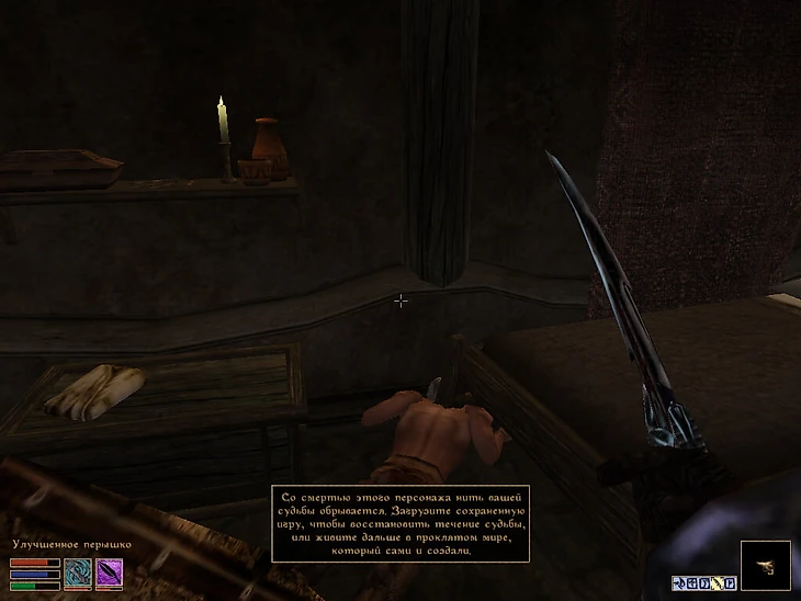 Ролевой отыгрыш без убийства квестовых NPC – как плавать с нарукавниками. Это постоянное чувство, что тебя контролируют, запрещают что-то делать, чтобы ты «не испортил себе игру». «Морровинд» общается с игроком как со взрослым – «Со смертью этого персонажа нить вашей судьбы обрывается. Загрузите сохраненную игру, чтобы восстановить течение судьбы, или живите в проклятом мире, который сами и создали».