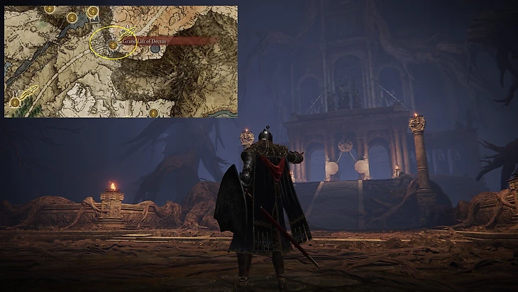 Вместе с двумя частями амулета можно отправляться к подъемнику Дектуса. Туда можно доехать своим ходом или использовать левый портал у главных ворот в академии Райи Лукарии. Вы окажетесь в самом начале Плато Альтуса, где удобнее всего начинать исследование. Правда на юге Плато очень мало костров, в основном они сосредоточены рядом со столицей Лейнделл.
