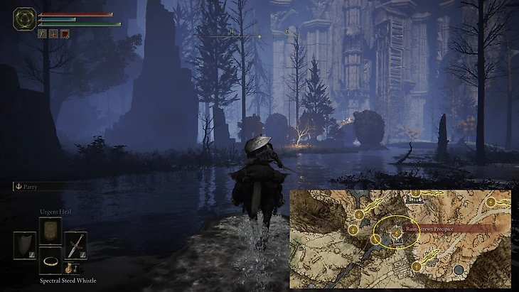 У форта, который находится в южной части локации, есть костер. В первой комнате будут нетопыри и сирены, атакующие ядом. Схватка с ними в замкнутом пространстве – серьезное испытание для персонажа, который только недавно победил Ренналу, поэтому лучше их пробежать. Проблема в том, что монстры продолжают нападать на приставной лестнице, которая ведет к сундуку с медальоном. Проходя эту локацию, я использовал покров мимика, делающий меня невидимым для сильных врагов. Еще можно призвать духов, которые отвлекут чудовищ на себя.
