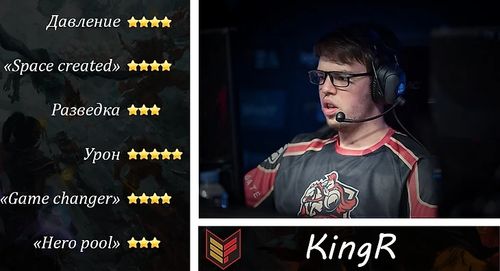 Ринат неплохо справляется с уничтожением вражеской экономики, но при этом часто оставляет и своих кор персонажей без должного внимания. Поэтому его команда не часто завладевает серьезным преимуществом на ранней стадии. Также необходимо отметить, разведка – слабая сторона данного игрока. KingR редко контролирует перемещения соперников, предпочитая оставаться на какой-то из линий. Несмотря на такой стиль игры в среднем он вносит меньше урона, чем его конкуренты из других команд. Что же касается вариативности в возможном выборе героев, она средняя. Ринат уверенно исполняет на большинстве популярных героев четвертой позиции, но каких-либо уникальных заготовок с его участием мы не видим.