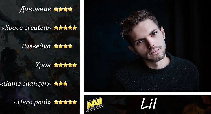 Если обратится к статистике последних турниров, то ранняя стадия игры не самая сильная сторона NAVI. Во многом это проблема присутствует из-за несыгранности саппортов данного коллектива, но не стоит оправдывать этим все. Все игры, в которых Lil отыгрывал на «четвертой позиции», он удачно справлялся только с частью своих обязанностей. А именно, предоставлял пространство для зарабатывания денег своим союзникам, при этом почти не создавая помех для соперников. Все это приводит к тому, что на протяжении первых 10-15 минут ни у одной из команд не появляется более-менее ощутимого преимущества. Основными плюсами Ильи можно назвать следующее: действительно большая вариативность героев, развязывающая руки на этапе драфтов и большой урон, который Lil выдает независимо от персонажа. Главными минусами этого игрока являются плохая разведка карты и практически полное отсутствие моментов, кардинально меняющих ход сражения.