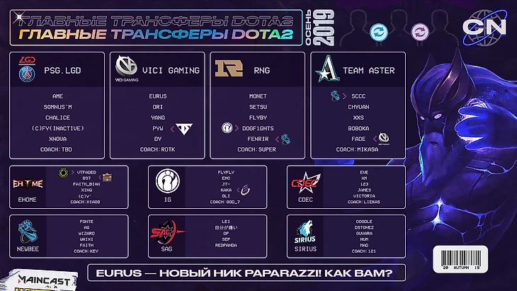 На смену LanMи Ah fu пришли dogf1ghts (на момент выхода материала dogf1ghts больше не числится в составе команды — прим.ред.) и Fenrir. LanM был лучшим игроком команды на прошедшем TI9 и явным лидером команды. Передвижения экс-четверки RNG играли важную роль в плейстайле команды, а активная помощь на линиях помогала быстро набирать преимущество и «сноуболить» игру. Dogf1ghts, выступавший за Invictus Gaming, считается хорошей четверкой по меркам Китая и даже входит в топ-40 регионального ладдера, но не факт, что он потянет тот объем полезных действий, который коры привыкли получать от игрока четвертой позиции. Что касается Fenrir, то несмотря на его колоссальный опыт, он давно не выступал на экстра уровне (последняя команда — NewBee, особо ничего не показавшая в прошлом сезоне), и есть риск, что он окажется слабым звеном в игровом плане.