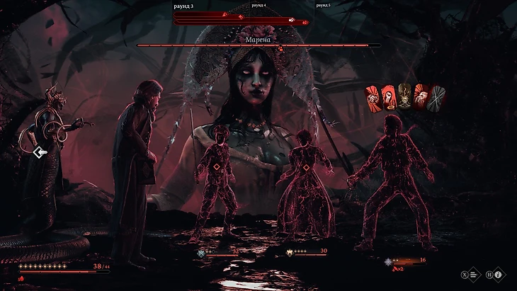 Нам доступны разнообразные атаки: затяжные-тяжелые, быстрые-лёгкие или средней тяжести. Некоторые удары могут накладывать дополнительные статусы, например, кровотечение, а есть те, которые пробивают концентрацию - менталочку наших врагов. Выбор атаки влияет на очерёдность ходов в раундах, иногда можно сбить ход противника, а порой и самому промахнуться! У Виктора тоже есть концентрация и лучше не доводить её до критического показателя. Анимации нападения монстров смотрятся очень эффектно, кровожадненько!