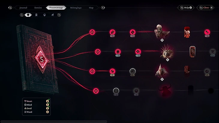 Все наши исследования и сбор необходимых предметов дают нам опыт, за который мы сможем прокачивать нашего героя. Очки Тауматургии можно распределять между четырьмя аспектами: Сердце, Разум, Деяние или Слово (они еще позволяют раскрыть соответствующие варианты ответов в диалогах). Всё это даёт нам определённые карты и способности существ для боя. Столкновения с противниками на улочках Варшавы были частыми, порой даже слишком, за каждую мелочь нас прессовали!