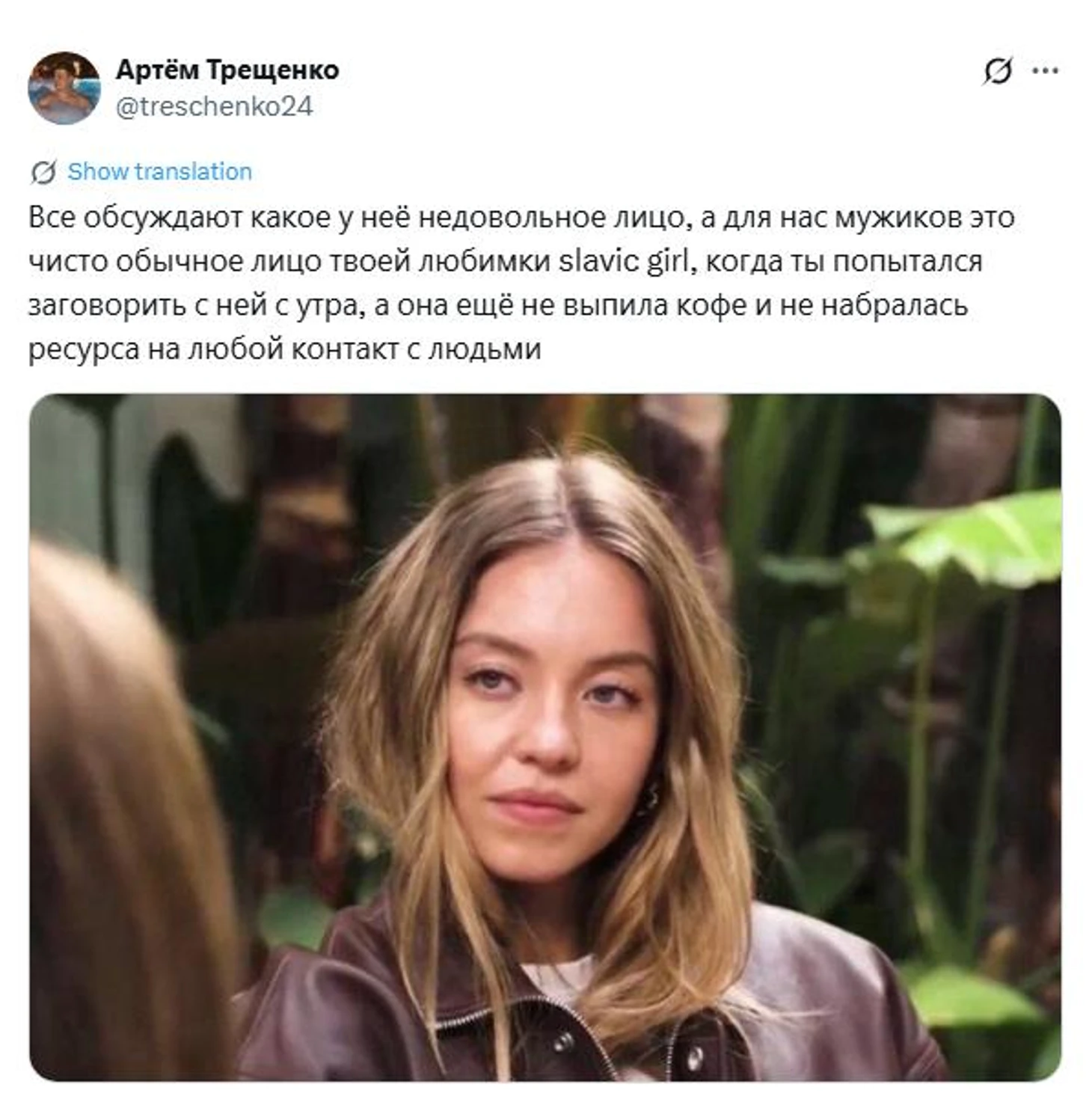 «Надменная Сидни Суини» – очень многогранный мем. Его используют, чтобы показать презрение, ощущение мира утром, некое восхищение красотой Сидни или даже, наоборот, с целью задеть актрису.