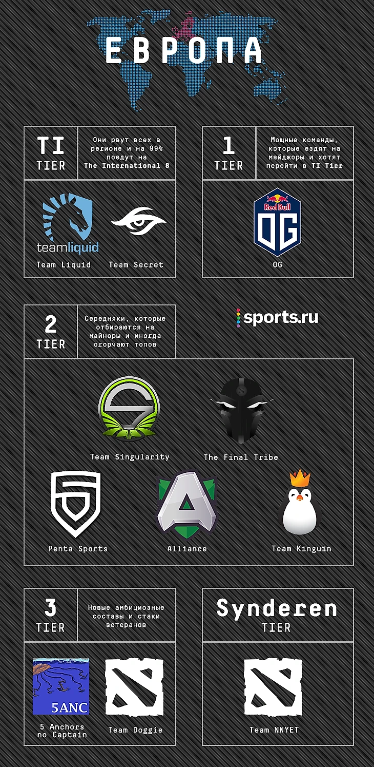 За Team Liquid и Team Secret лучше всего говорит их положение в рейтинговой таблице. Две сильнейшие команды Европы (а возможно, и мира) фактически гарантировали себе участие на TI, но сбавлять не планируют. Полноценных тир-1 команд в Старом Свете, кроме OG, не осталось, а потому команда Флая и Нотейла не встречает серьезной конкуренции в региональных квалификациях.