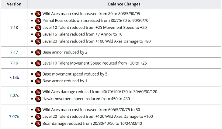 Практически сразу разработчики поняли, что облажались с балансом и принялись за нерфы. Били по двум аспектам: лайнингу и слишком сильной способности Wild Axes. Для того чтобы ослабить Бистмастера в ранней игре, ему дважды уменьшали базовую броню и ослабили талант на бонусную броню на 15-м уровне. То же самое проделали со скоростью перемещения героя – снизили базовую и ослабили талант.