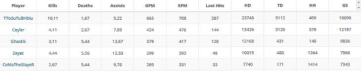 По основным показателям в ранней игре наблюдается примерное равенство. Теперь попробуем оценить общую эффективность Сейлера. Помните, мы рассказывали про систему оценки игроков исходя из того, как игроки конвертируют потраченное золото в урон по героям и вышкам? Лучше с тех пор ничего не придумали.