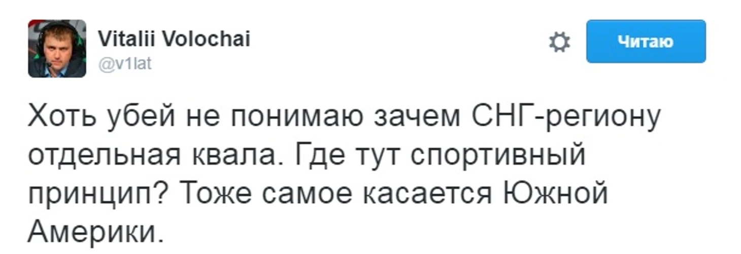 «Очевидно, что с более сильных регионов, такие как Европа и Китай, должно проходить больше команд, а с более слабых – меньше. В то же время определять какой регион сильнее «на глазок» недопустимо. В большом спорте давно существует система, которая вполне подойдет и нам.