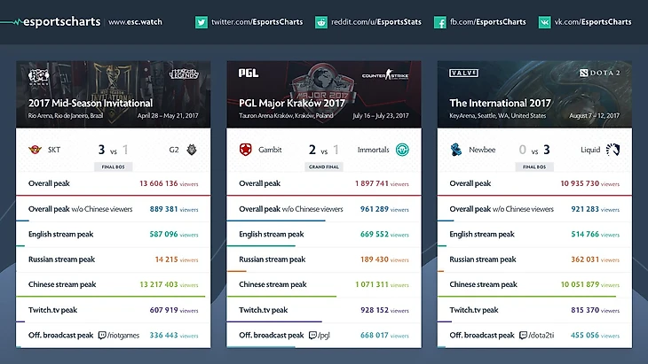 Ребята из eSports Charts сравнили главные турниры по каждой из трех основных киберспортивных дисциплин и свели данные по просмотрам в единую таблицу.