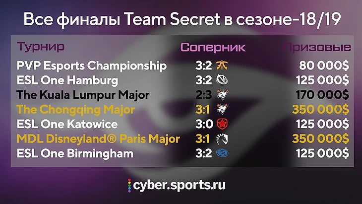 ESL One Birmingham стал очередным победным турниром для Team Secret. Всего в сезоне 2018-2019 команда приняла участие в 10 турнирах и выходила в финал в 7 из них. Исключения – Maincast Autum Brawl, MegaFon Winter Clash и DreamLeague Season 11 (4 место после 1:2 от Virtus.pro в полуфинале нижней сетки).