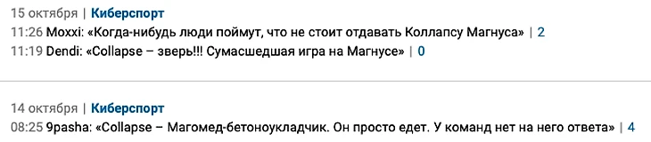 Коллапсу сейчас 19 лет, он родом из Махачкалы. Классическая для многих киберспортсменов история – у Магомеда были не очень хорошие отношения с родителями из-за проблем с учебой. Но после первых призовых все стало нормально, а когда его год назад пригласили в Team Spirit, все стало еще лучше. Сейчас родители его полностью поддерживают, а за первое место на The International 10 Халилов заработал 3,6 млн долларов за вычетом доли клуба (обычно около 10%) и налогов.