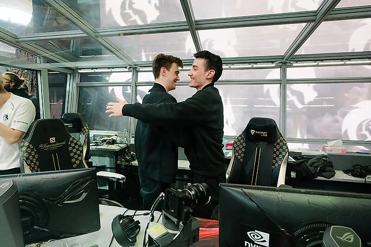 Коллапс и капитан Team Spirit Ярослав «Miposhka» Найденов поздравляют друг друга после выхода в финал.
