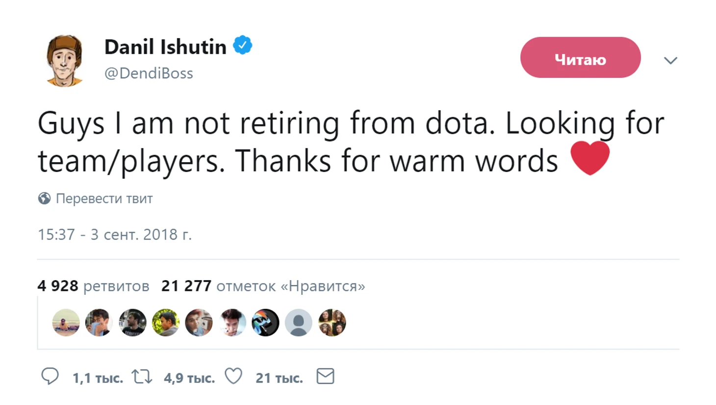 Спустя некоторое время после объявления, Dendi сообщил в своём аккаунте в twitter, что не собирается заканчивать карьеру и находится в поиске.