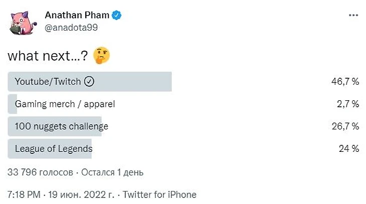Двукратный чемпион The International по Dota 2 Анатан ana Фам спросил у подписчиков в твиттере, чем ему заниматься дальше. Он опубликовал в социальной сети опрос, где среди вариантов были стримы, выпуск мерча для геймеров или переход в League of Legends.