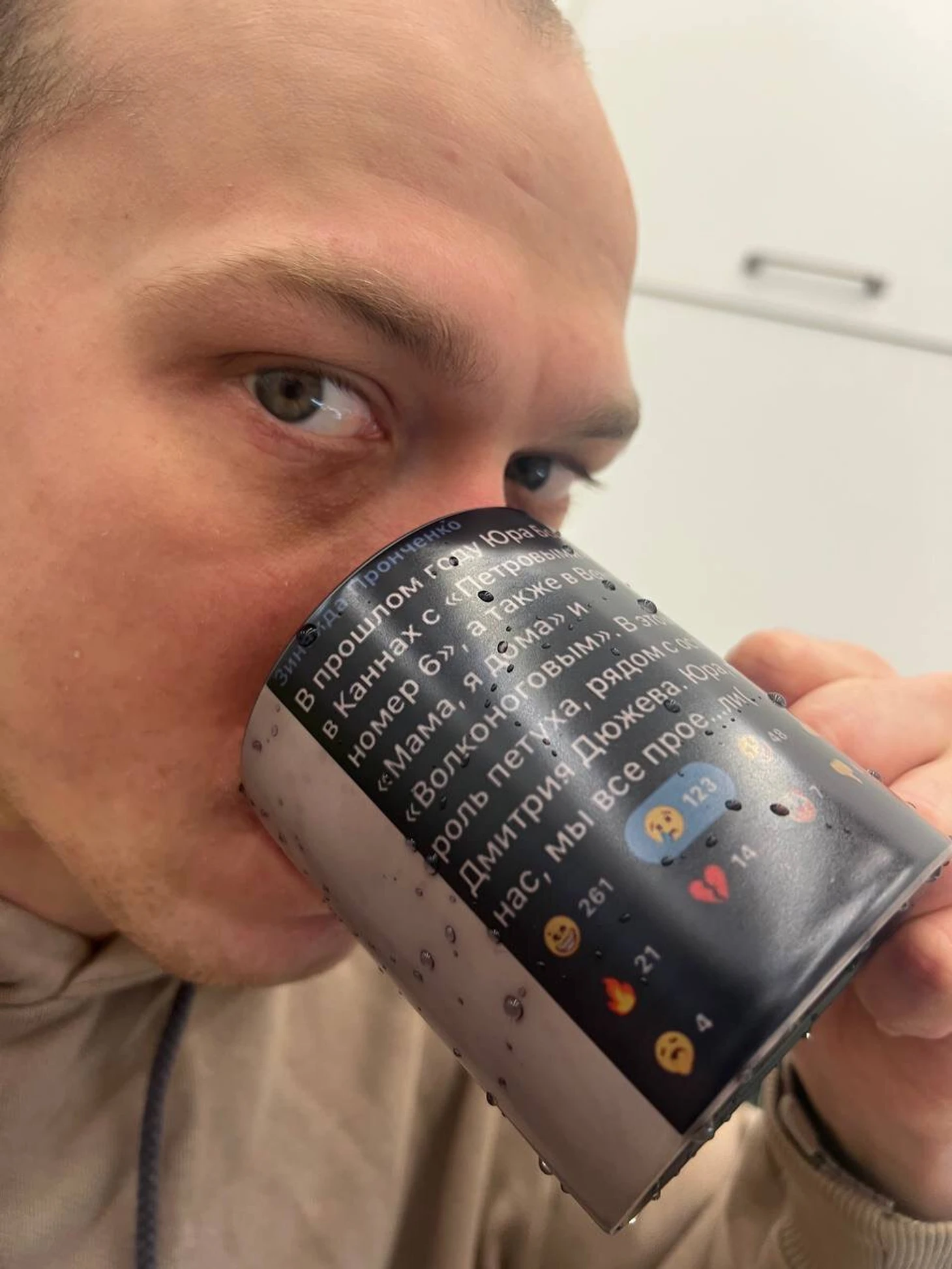 «Главное, считаю, уметь признавать свои ошибки. На этом снимке Юра Борисов пьет кофе (?) из кружки, на которой напечатан мой пост – о том, что его международная карьера, кажется, окончена. Фото – собственность номинанта на премию «Оскар».