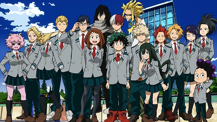 Серый пиджак, белая рубашка, темно-бирюзовые брюки или юбка и красный галстук – сдержанно и симпатично. Ученики носят форму свободно, добавляя детали на свой вкус. В школе, где готовят будущих героев, одежда должна быть удобной. Поэтому в аниме есть и спортивный костюм в фирменных цветах, который стал таким же узнаваемым, как основная форма.