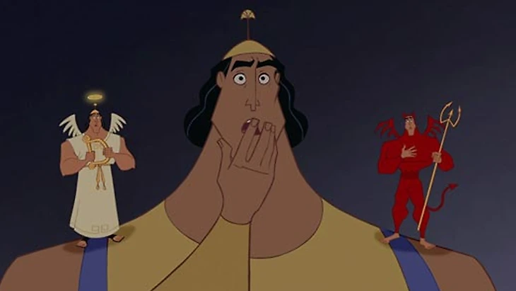 Работает это так: на одном плече появляется маленький ангел, на другом – демон. Изображает внутренний конфликт при выборе между правильным и неправильным. Ангел предлагает сделать что-то правильное и скучное, демон соблазняет сделать что-то веселое, но плохое. Пока они спорят, герой мучается выбором.
