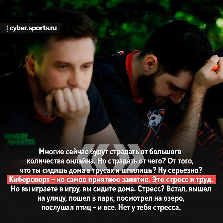 Да, психологически и эмоционально киберспорт – это не самое приятное занятие. Это стресс и труд. Но вы играете в игру, вы сидите дома. Стресс? Встал, вышел на улицу, пошел в парк, посмотрел на озеро, послушал птиц – и все. Нет у тебя стресса.