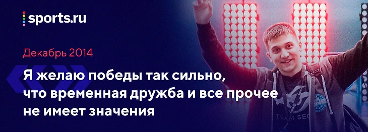 Декабрь 2014: «Я хотел сказать, что я желаю победы так сильно, что такие вещи, как временная дружба и все прочее, не имеют значения. Я хочу победить, чтобы испытать чувство удовлетворенности. Шучу, хотя так оно в принципе и есть», – эта фраза была практически завершающим аккордом того самого стрима. Квинтэссенция его психологии победителя. Его окружение делилось не на хороших и плохих игроков, не на добрых и злых. А на тех, с кем он победил и с кем он проиграл. EG на The Summit 3, Secret на TI5, EG на первых мейджорах, затем Secret на TI6 – все они проиграли. Без полумер и полутонов.