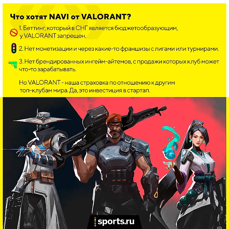 Второй момент – все-таки пока что это не приводит к чему-то конкретному. Нужно посмотреть, как сформируется эта экосистема. Сейчас в VALORANT огорчают тем, что забанены некоторые категории спонсоров, их убрали, но при этом абсолютно ничего не дали взамен. Нужно понять, как ты собираешься монетизировать эту историю. Если ты не можешь показывать партнеров, они не будут тебе платить – это очевидно. А беттинг, который в СНГ является бюджетообразующим, у VALORANT запрещен.