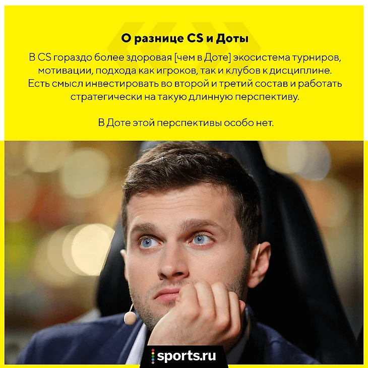 Почему это происходит? Потому что в CS гораздо более здоровая экосистема турниров, мотивации, подхода как игроков, так и клубов к дисциплине. И это все приводит к точке, в которой есть смысл инвестировать во второй и третий состав и работать стратегически на такую длинную перспективу. В Доте этой перспективы особо нет.