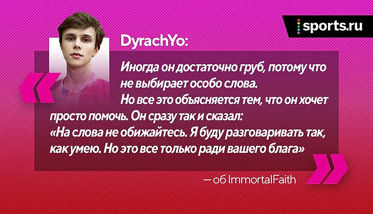 – Мы знаем, что ImmortalFaith занимается драфтами и стратегиями. Как выстроена с ним работа и что это за человек? Как он из просто игроков делает хороших игроков?