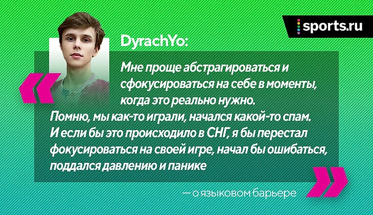 – Английский может сыграть и в минус, и в плюс. Я замечал, что мне проще абстрагироваться и сфокусироваться на себе в моменты, когда это реально нужно. И не замечать бесполезной информации, она не засоряет голову. Помню, мы как-то играли, начался какой-то спам. И если бы это происходило в СНГ, я бы перестал фокусироваться на своей игре, начал бы ошибаться, поддался давлению и панике. А тут я оставался спокойным и просто абстрагировался от их языка. Только подмечал нужную информацию.