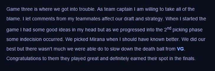 Проигрыш на TI4, проваленный MLG, неудачный Summit 2, уход Артура и Людвига, кик Aui_2000 – после каждой мини-катастрофы в команде он первым выходил на контакт с публикой и принимал огонь на себя. После TI4 он написал множество блогов, в каждом интервью и на каждом стриме он говорил, что это поражение – исключительно его вина. Потому что он – капитан, и каждое решение в команде лежит на его совести.