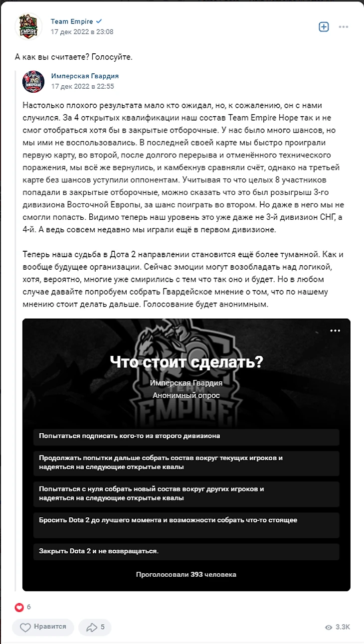 После начала СВО у ЕЕЕ забрали права на трансляцию DPC сезона и в обойме организации осталась только Dota 2 Champions League. За год тир-2 турнир для Западной и Восточной Европы превратился в неофициальный третий дивизион СНГ-региона – иностранные команды отказывались принимать участие.