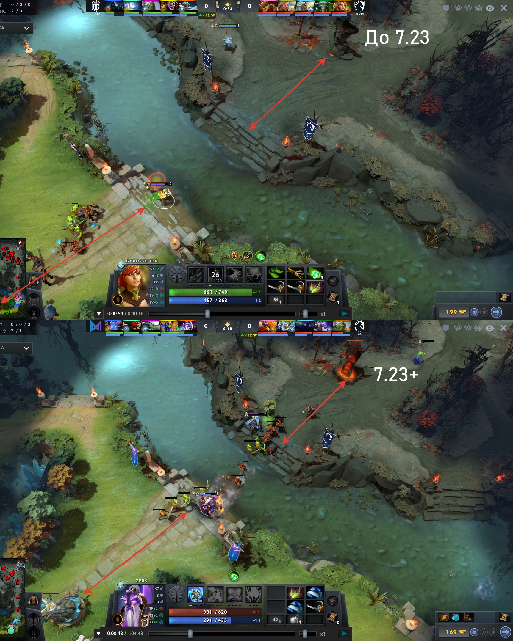 Но главный баф Клокверка-четверки в 7.23 заключался в другом. Карту изменили, и теперь гангать мид стало тяжелее: площадь перед башней уменьшили (особенно со стороны Тьмы), подходы к миду тоже укоротили и сузили, башни поставили ближе к реке (плюс тавера и их ауры усиливали в последующих патчах). Роумеры, гангавшие мид, стали слабее, а значит Клокверк-четверка стал относительно сильнее. Из мелочей – узкие пространства в миде, в том числе и сузившийся подъем с реки по центральной линии, проще закрывать когами, если Клок все-таки вышел в ганк.
