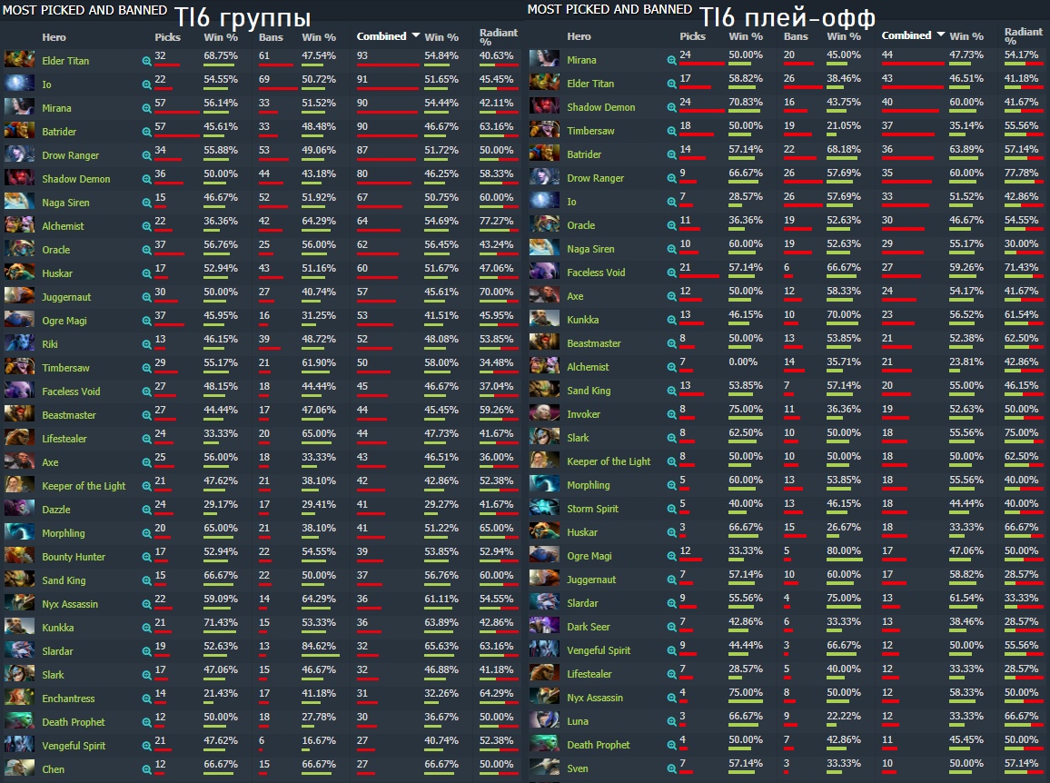 Видимо, не умевшие доминировать линию офлейнеры тогда слабо котировались – тяжело было Dark Seer (более-менее игрался в плей-офф, но в группах имел 8 пиков и 25% винрейт), Doom (2 пика), Omniknight (1 пик) и некоторым другим. При этом многие выпавшие из меты офлейнеры могли хотя бы набирать нетворс. Как и, впрочем, метовые тройки (кроме Slardar).