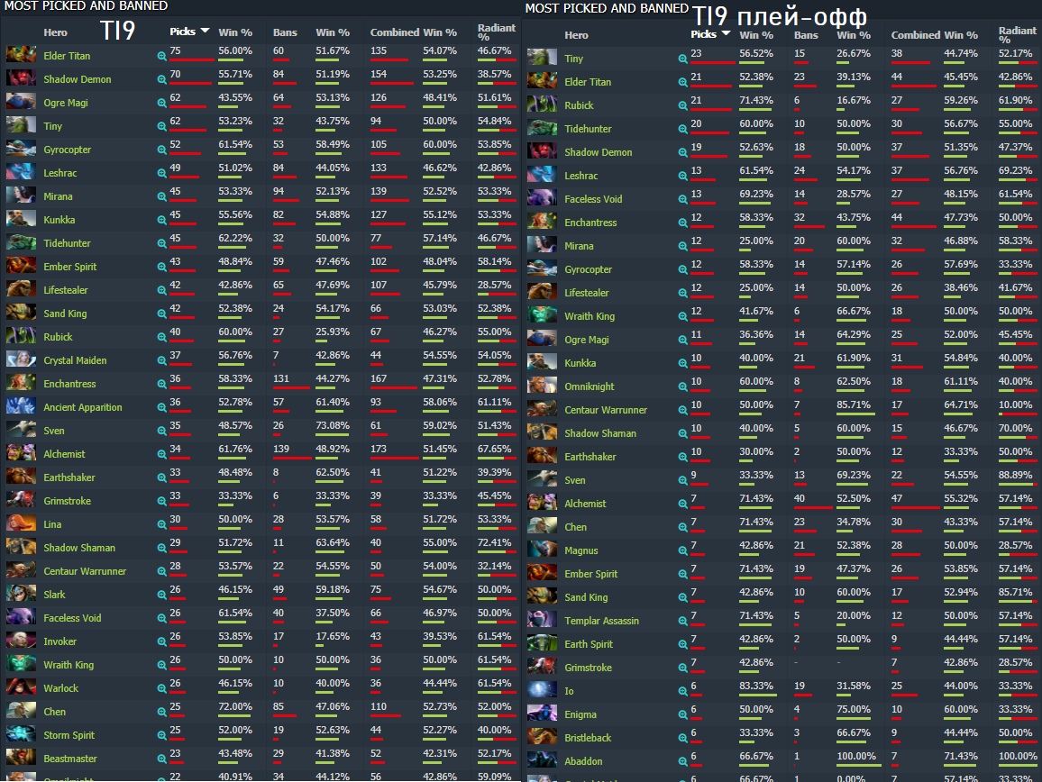Исход логичный – 0 пиков и 1 бан на TI9. Из вероятных причин непопулярности Клокверка на Инте, помимо исчезновения героя с радара на весь предшествовавший сезон, можно выделить следующие: