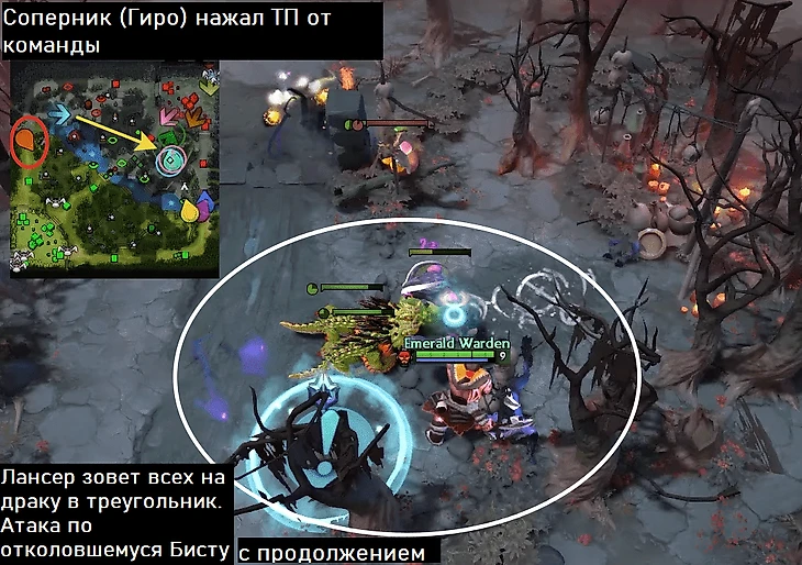 Яркий пример продемонстрировал BSJ в одном из недавних видео. Вражеская команда оккупировала треугольник, но Гирокоптер улетел на противоположную линию, чтобы зафармить пару пачек. Лансер моментально коллит нападать в треугольник и бежит туда сам (не на ТП, а пешком!).