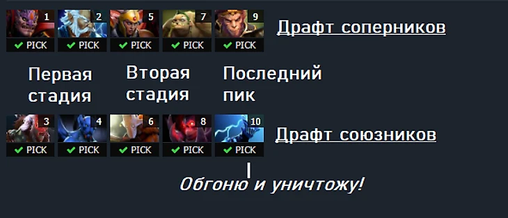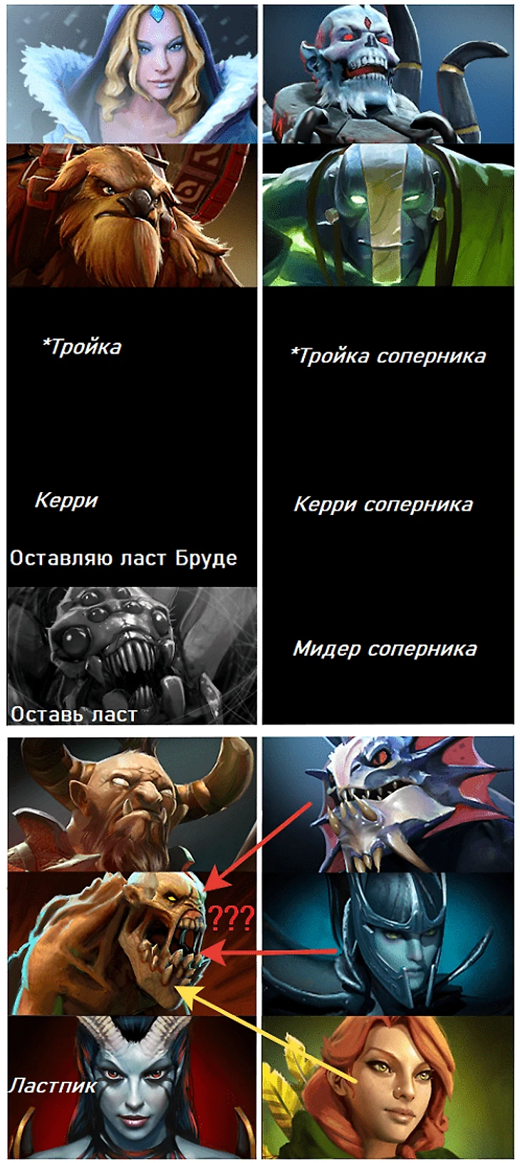 Наконец, не обязательно оставлять ластпик именно керри. Если и первая, и вторая позиции берут универсальных героев без большого количества контрпиков, последний выбор можно дать тройке. Оффлейнер увидит либо вражеского керри и жестко закроет его на линии, либо вражеского мидера и поймет, нужен ли герой с аурами и можно ли взять жадного персонажа.