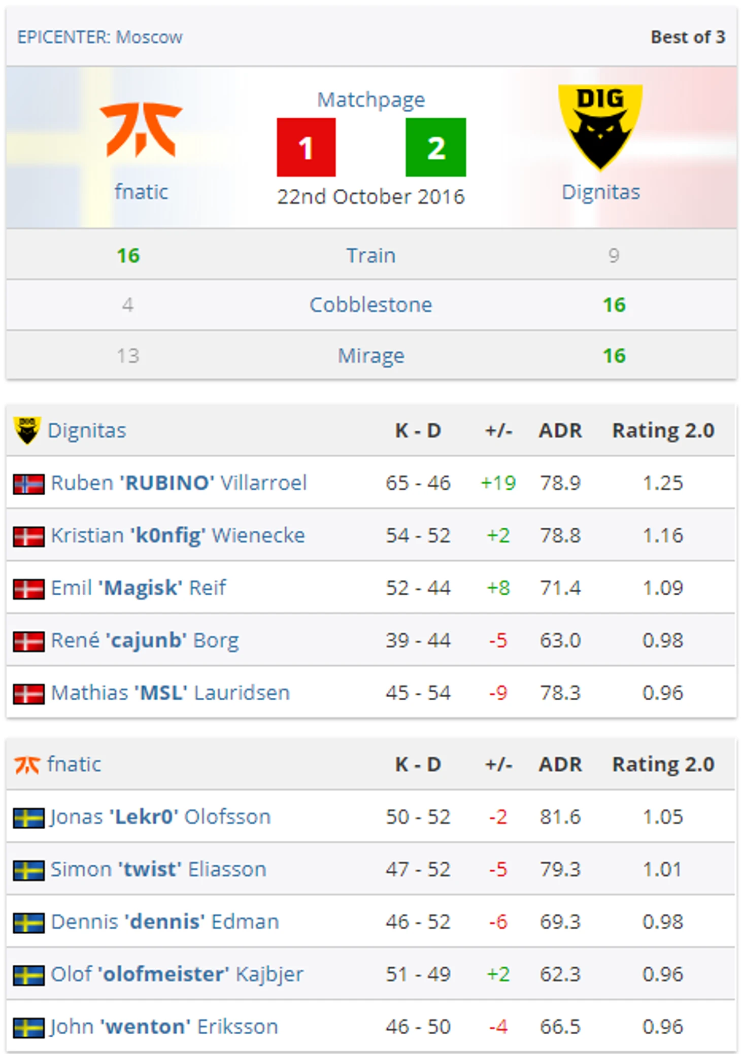 Во втором четвертьфинале встречались Dignitas и Fnatic. Хоть датчане и являлись темной лошадкой, шансы на победу у них были. Шведский CS тогда переживал не лучшие времена: летом того года случился знаменитый решаффл Fnatic и GODSENT, который вообще себя не оправдал, как показало время. Позитивные ожидания по поводу Dignitas оправдались и, несмотря на проигрыш первой карты, они разобрались с оппонентом на следующих двух. Нынешняя звезда Астралис Мэджиск тогда только делал свои первые шаги в профессиональном Контер-Страйке, а его никнейм выглядел немного иначе, чем сейчас: Magiskb0Y. Мальчик вырос.